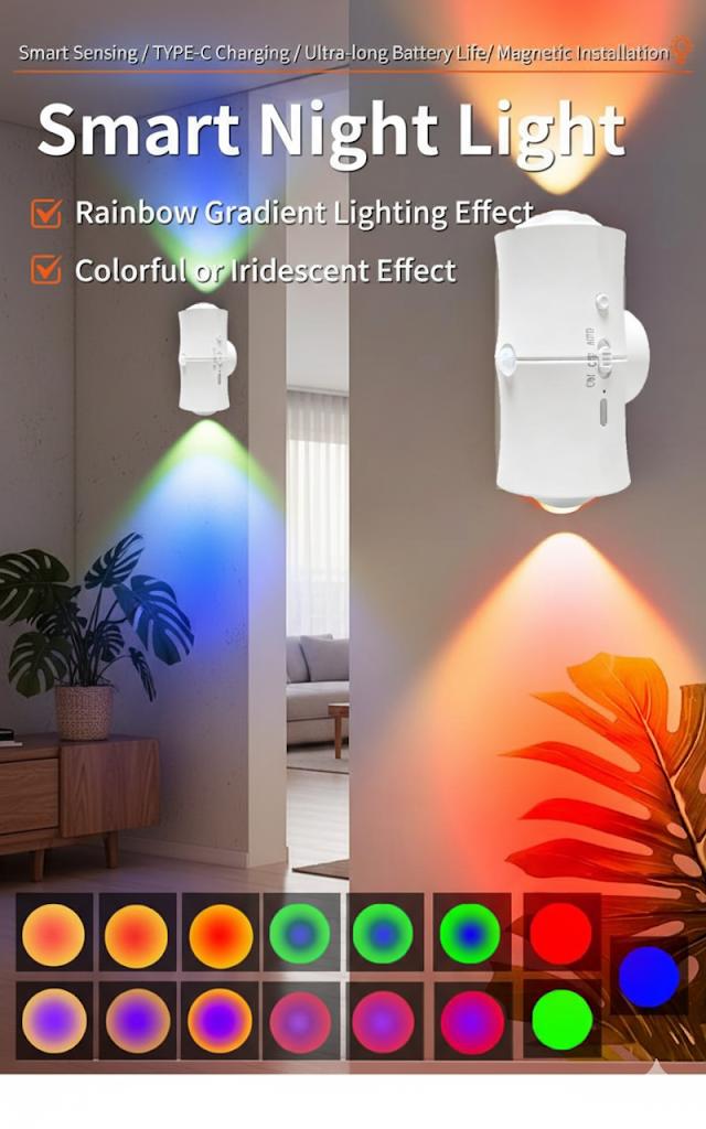 Smart RGB Motion Sensor Night Light, Magnetic LED Wall Sconce, USB Rechargeable Dimmable Ambient Lighting for Bedroom, Hallway, Stairs, Wardrobe, Entryway Home Decor